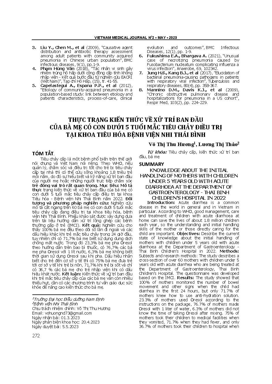 Thực trạng kiến thức về xử trí ban đầu của bà mẹ có con dưới 5 tuổi mắc tiêu chảy điều trị tại khoa tiêu hóa Bệnh viện Nhi Thái Bình = Knowledge about the initial handling of mothers with children under 5 years old with acute diarrhoea at the department o