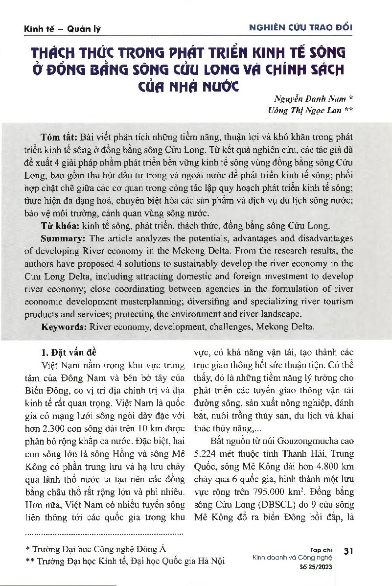 Thách thức trong phát triển kinh tế sông ở đồng bằng sông Cửu Long và chính sách của nhà nước = Challenges in river - economic development in Cuu Long river delta and government's policies