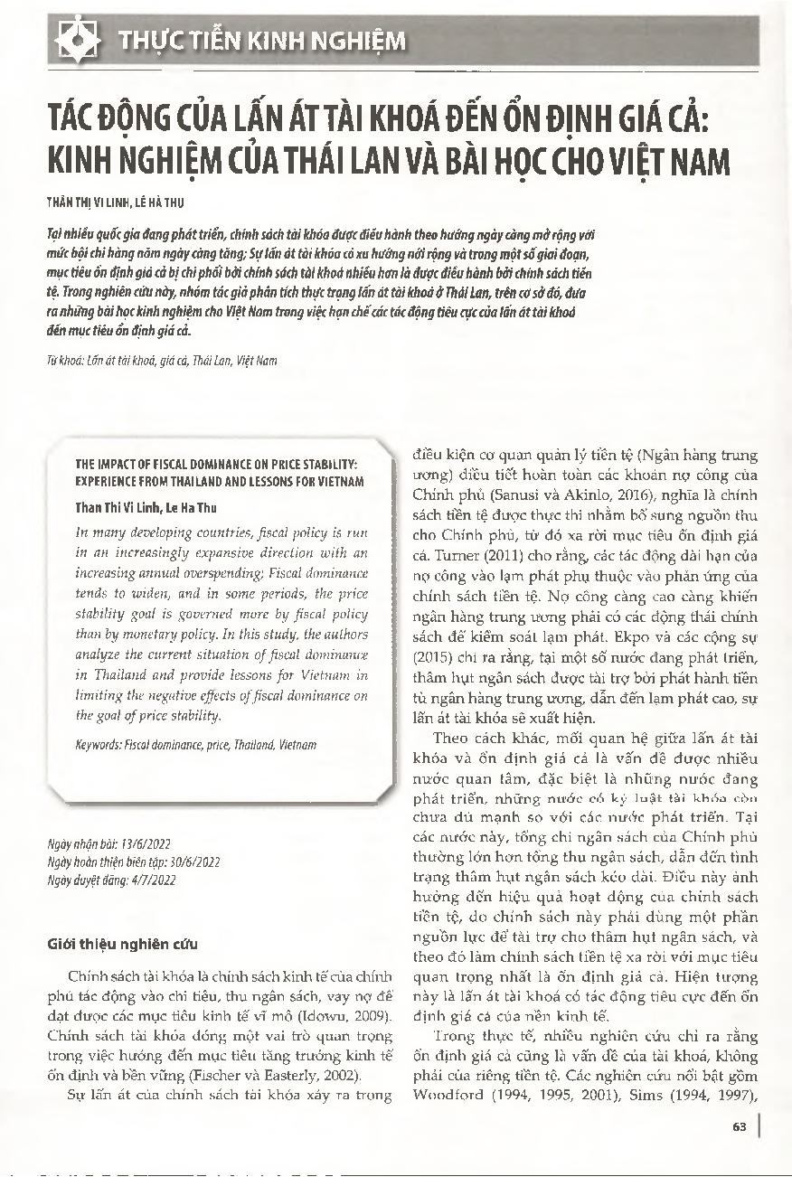 Tác động của lấn át tài khóa đến ổn định giá cả: Kinh nghiệm của Thái Lan và bài học cho Việt Nam = The impact of fiscal dominance on price stability: Experience from Thailand and lessons for Vietnam