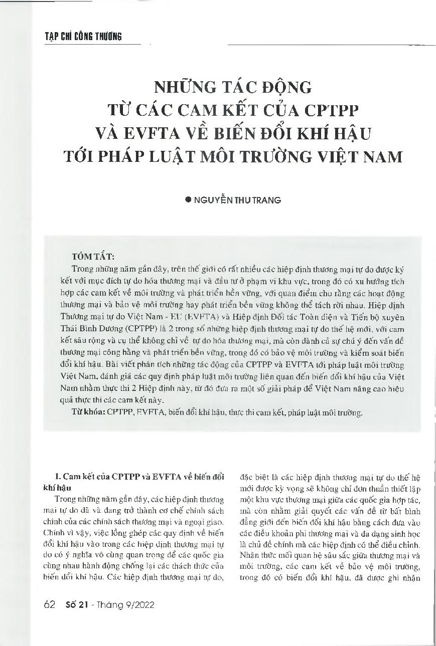 Những tác động từ các cam kết của CPTPP và EVFTA về biến đổi khí hậu tới pháp luật môi trường Việt Nam = Impacts of climate change commitments under the CPTPP and the EVFTA on Vietnam&; 39;s environmental regulations