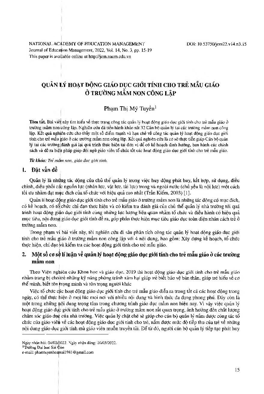 Quản lý hoạt động giáo dục giới tính cho trẻ mẫu giáo ở trường mầm non công lập = Management of sex educational activities for public kindergarten children