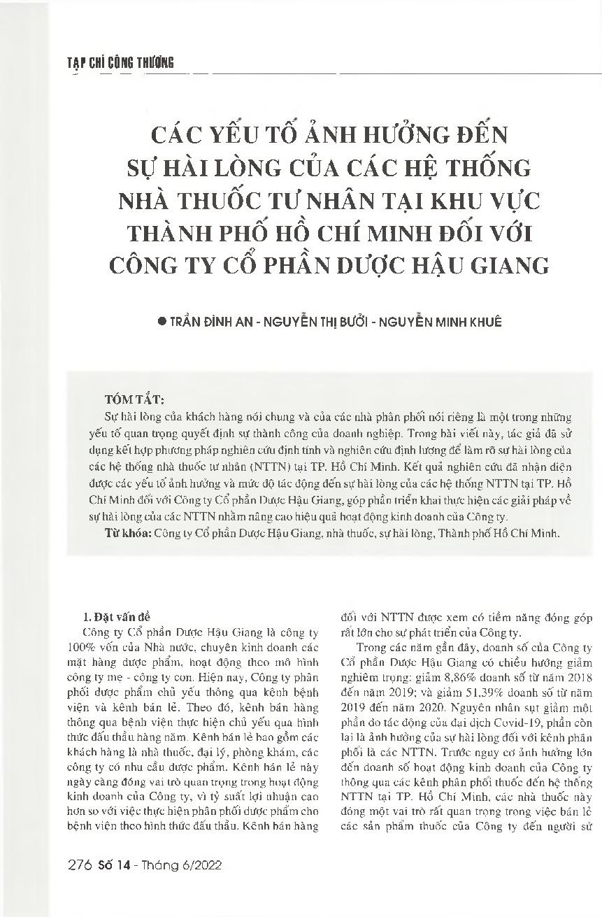 Các yếu tố ảnh hưởng đến sự hài lòng của các hệ thống nhà thuốc tư nhân tại khu vực Thành phố Hồ Chí Minh đối với Công ty cổ phần Dược Hậu Giang = Factors affecting the satisfaction of private pharmacy systems in Ho Chi Minh City with Hau Giang Pharmaceut