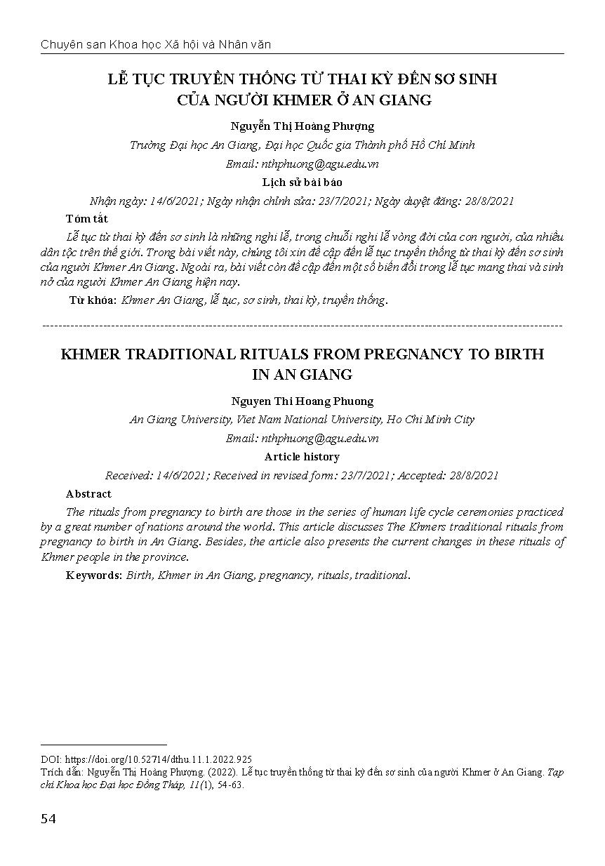 Lễ tục truyền thống từ thai kỳ đến sơ sinh của người Khmer ở An Giang = Khmer traditional rituals from pregnancy to birth in An Giang