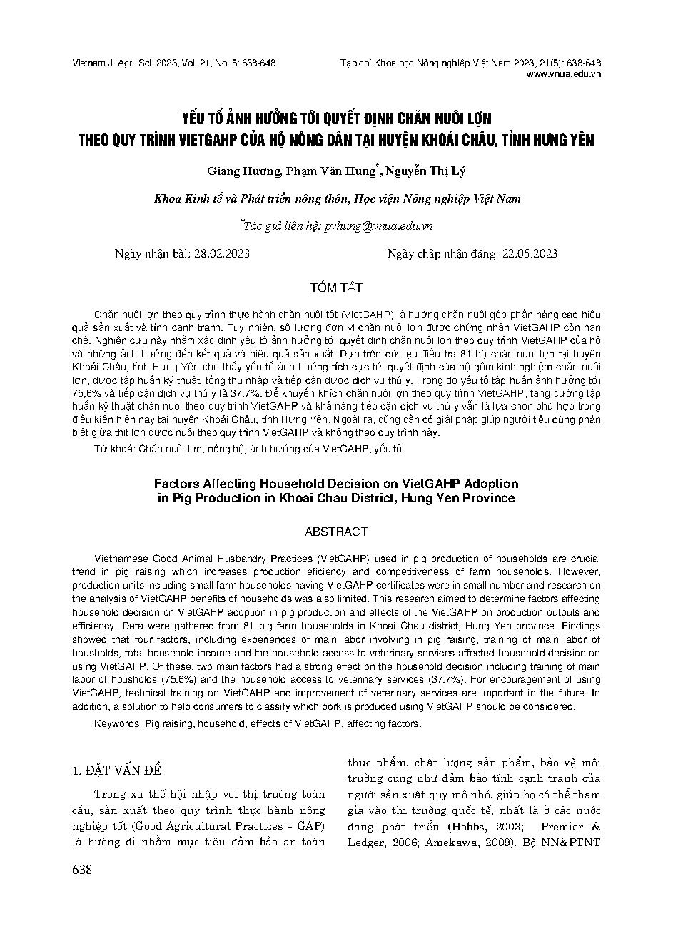 Yếu tố ảnh hưởng tới quyết định chăn nuôi lợn theo quy trình VietGAHP của hộ nông dân tại huyện Khoái Châu, tỉnh Hưng Yên