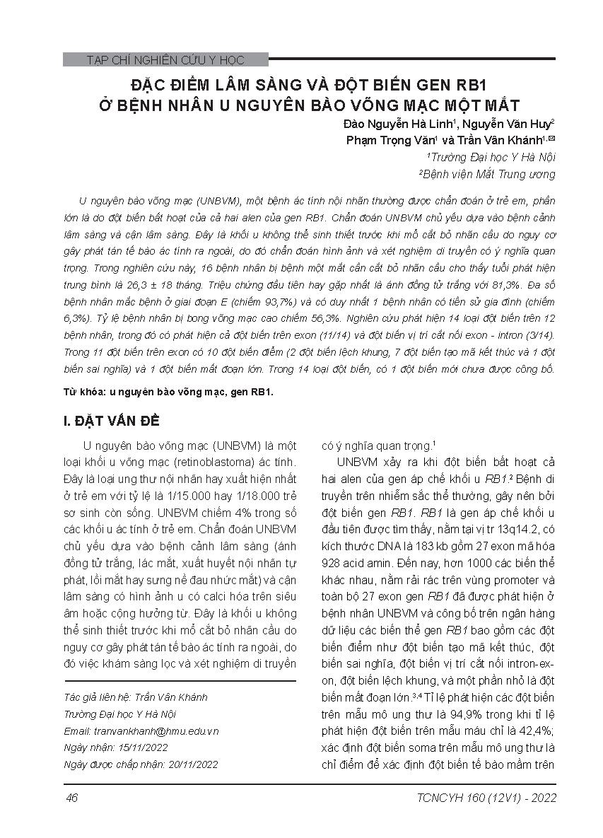 Đặc điểm lâm sàng và đột biến gen RB1 ở bệnh nhân u nguyên bào võng mạc một mắt = Clinical characteristics and mutations of RB1 gene in unilateral retinoblastoma patients