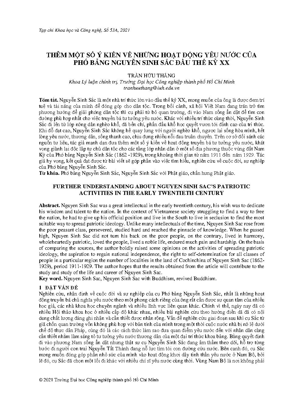 Thêm một số ý kiến về những hoạt động yêu nước của phó bảng Nguyễn Sinh Sắc đầu thế kỷ xx = Further understanding about nguyen sinh sac’s patriotic activities in the early twentieth century