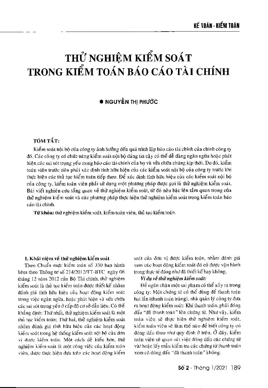 Thử nghiệm kiểm soát trong kiểm toán báo cáo tài chính = Test of controls in financial statements audit