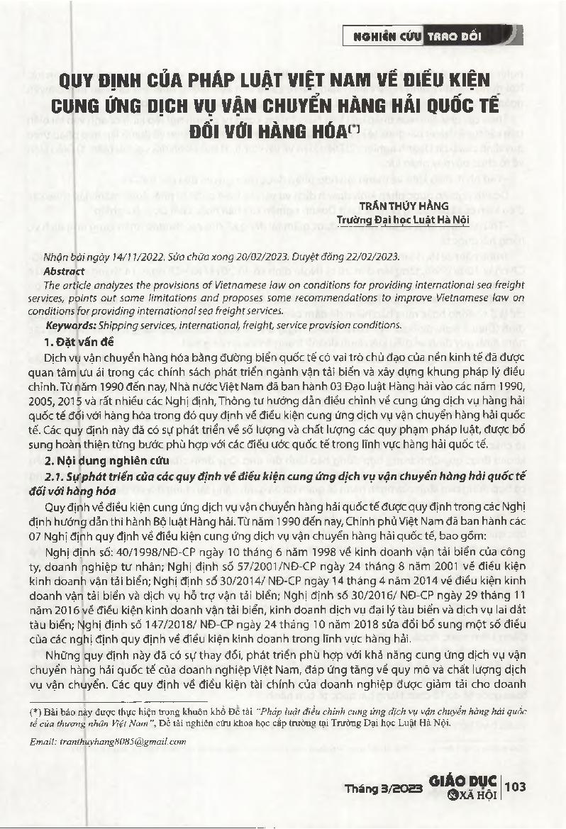 Quy định của pháp luật Việt Nam vể điều kiện cung ứng dịch vụ vận chuyển hàng hải quốc tế đối với hàng hóa = Provisions of Vietnamese law on conditions for international sea freight services.