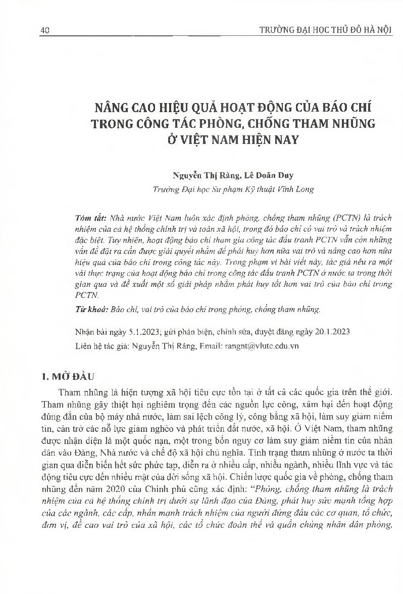 Nâng cao hiệu quả hoạt động của báo chí trong công tác phòng, chống tham nhũng ở Việt Nam hiện nay = Improving the performance of the press in the prevention and anti-corruption in Vietnam