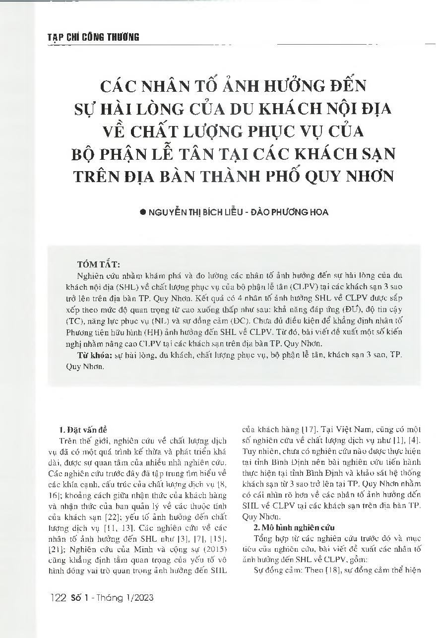 Các nhân tố ảnh hưởng đến sự hài lòng của du khách nội địa về chất lượng phục vụ của bộ phận lễ tân tại các khách sạn trên địa bàn TP. Quy Nhơn = Factors affecting the front desk department's service quality of 3-star hotels in Quy Nhon city