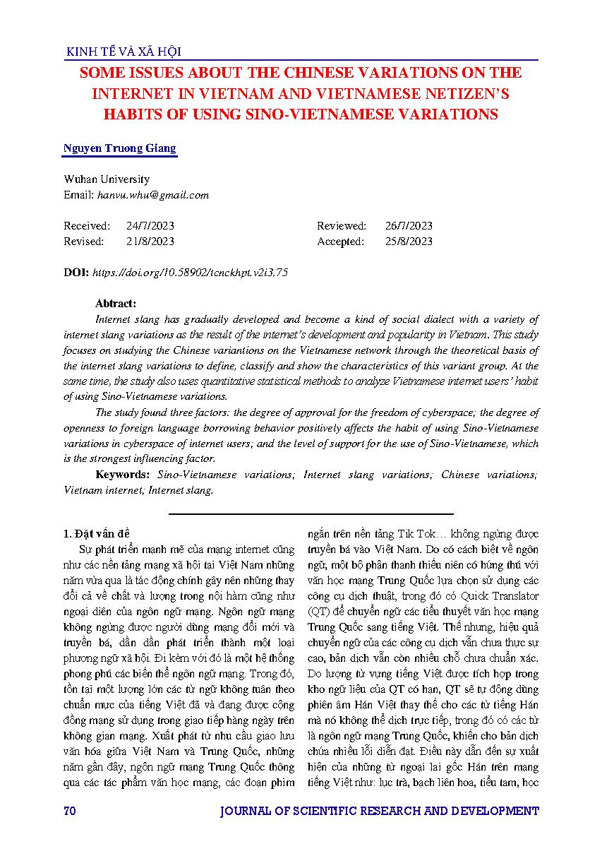 Một số vấn đề về biến thể tiếng Hán trên mạng tiếng Việt và thói quen sử dụng biến thể âm Hán Việt của người dùng mạng Việt Nam = Some issues about the Chinese variations on the internet in Vietnam and Vietnamese netizen's habits of using Sino-Vietnamese