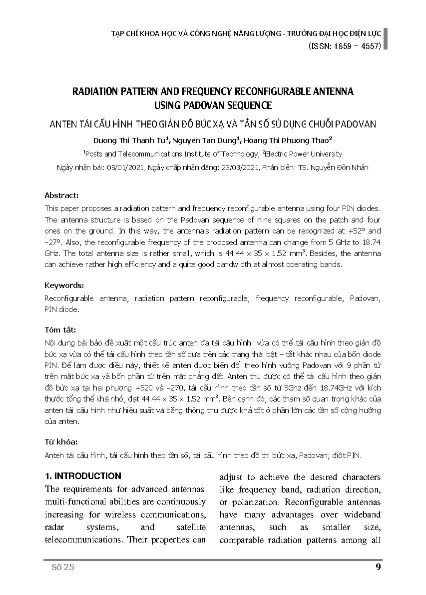 Anten tái cấu hình theo giản đồ bức xạ và tần số sử dụng chuỗi padovan = Radiation pattern and frequency reconfigurable antenna using padovan sequence