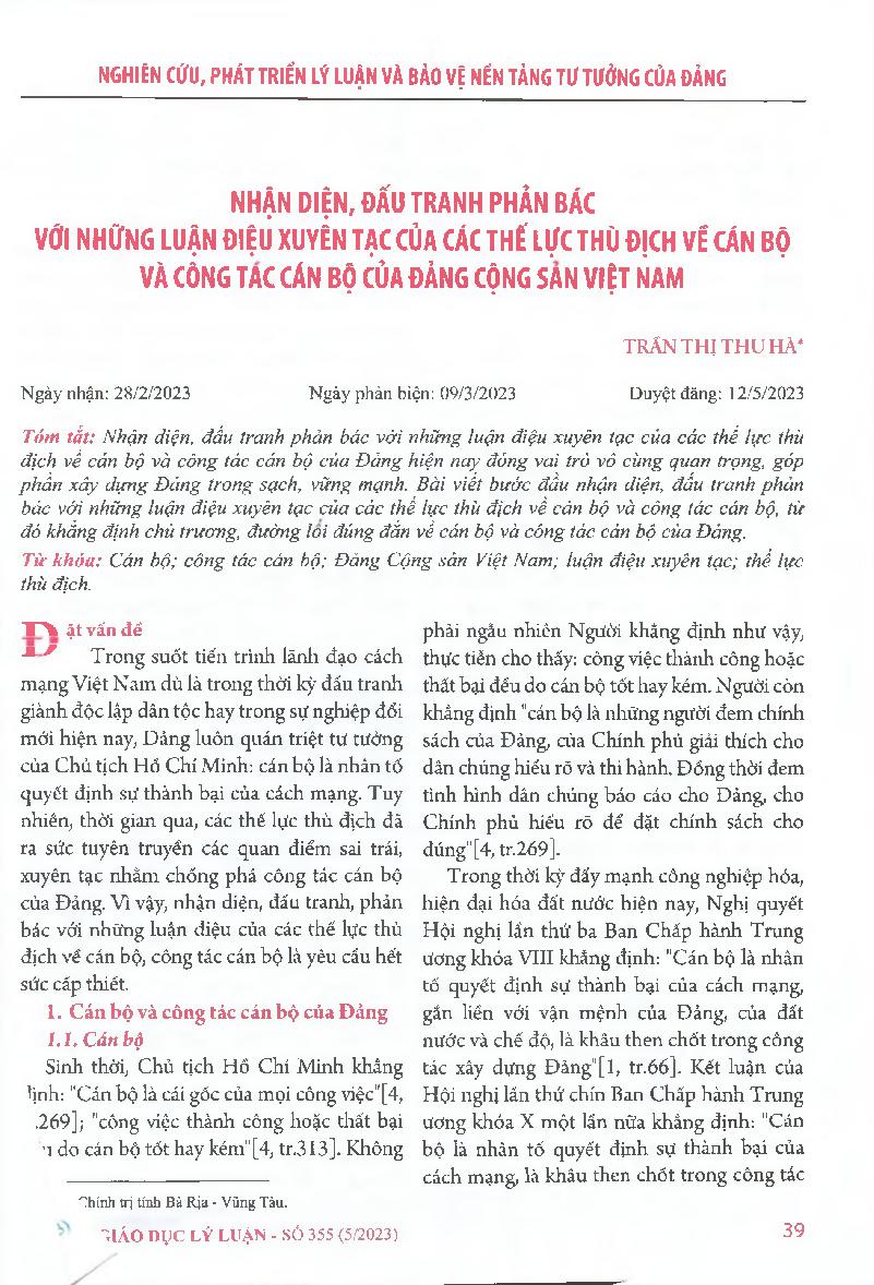 Nhận diện, đấu tranh phản bác với những luận điệu xuyên tạc của các thế lực thù địch vẽ cán bộ và công tác cán bộ của Đảng Cộng sản Việt Nam = Identify and counter- arguing against the misrepresentations of hostile forces regarding officials and personnel