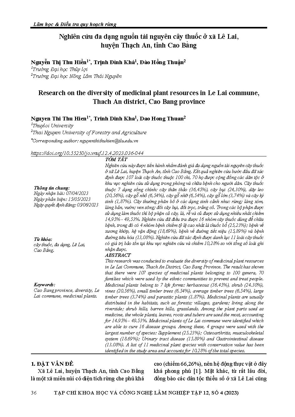 Nghiên cứu đa dạng nguồn tài nguyên cây thuốc ở xã Lê Lai, huyện Thạch An, tỉnh Cao Bằng = Research on the diversity of medicinal plant resources in Le Lai commune, Thach An district, Cao Bang province