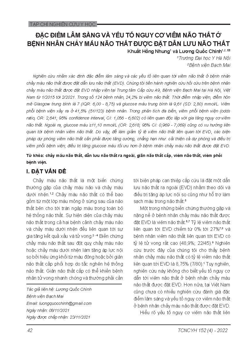 Đặc điểm lâm sàng và yếu tố nguy cơ viêm não thất ở bệnh nhân chảy máu não thất được đặt dẫn lưu não thất = Clinical characteristics and risk factors for ventriculitis in patients with intraventricular hemorrhage undergoing external ventricular drainage