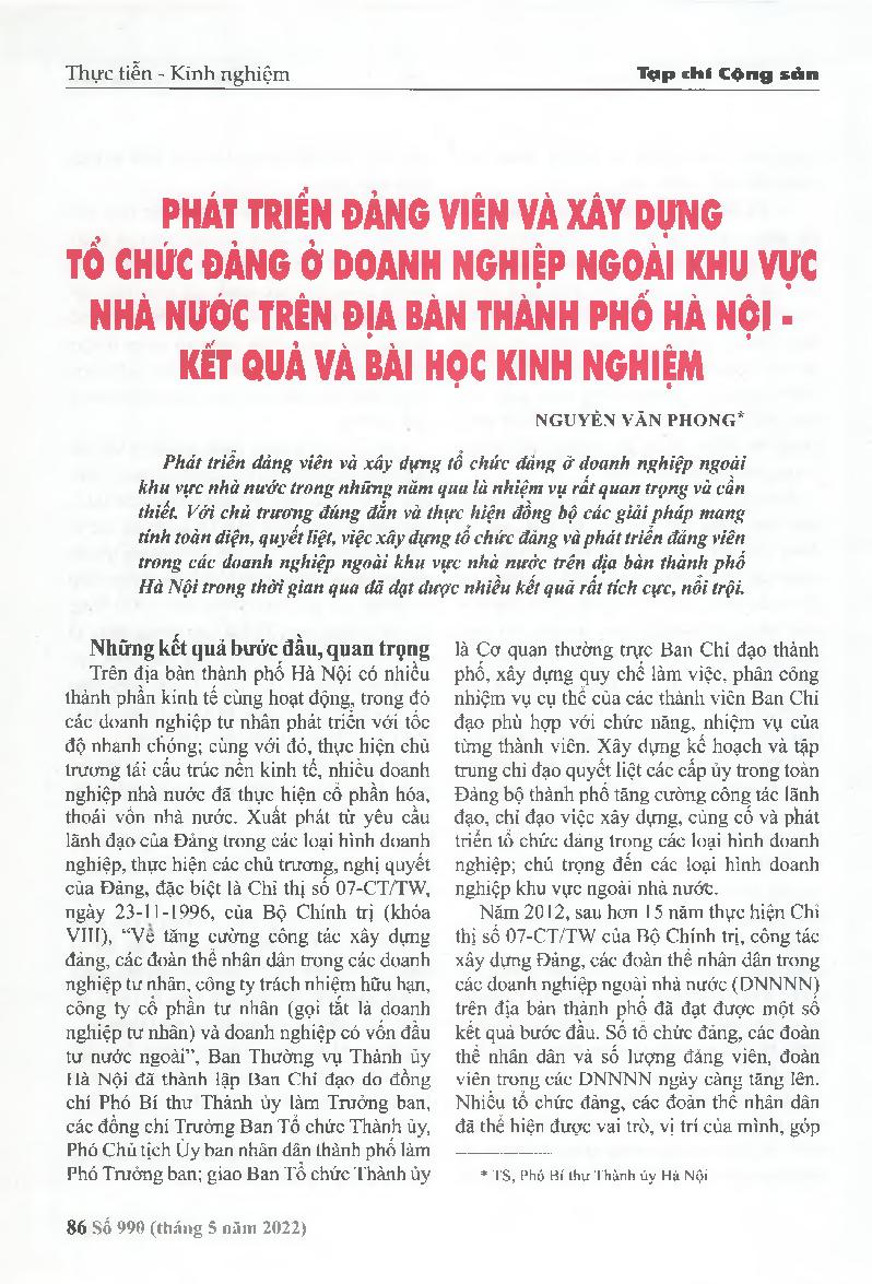 Phát triển đảng viên và xây dựng tổ chức đảng ở doanh nghiệp ngoài khu vực nhà nước trên địa bàn thành phố Hà Nội - Kết quả và bài học kinh nghiệm = Developing party members and building party organizations in enterprises outside the state sector in Hanoi