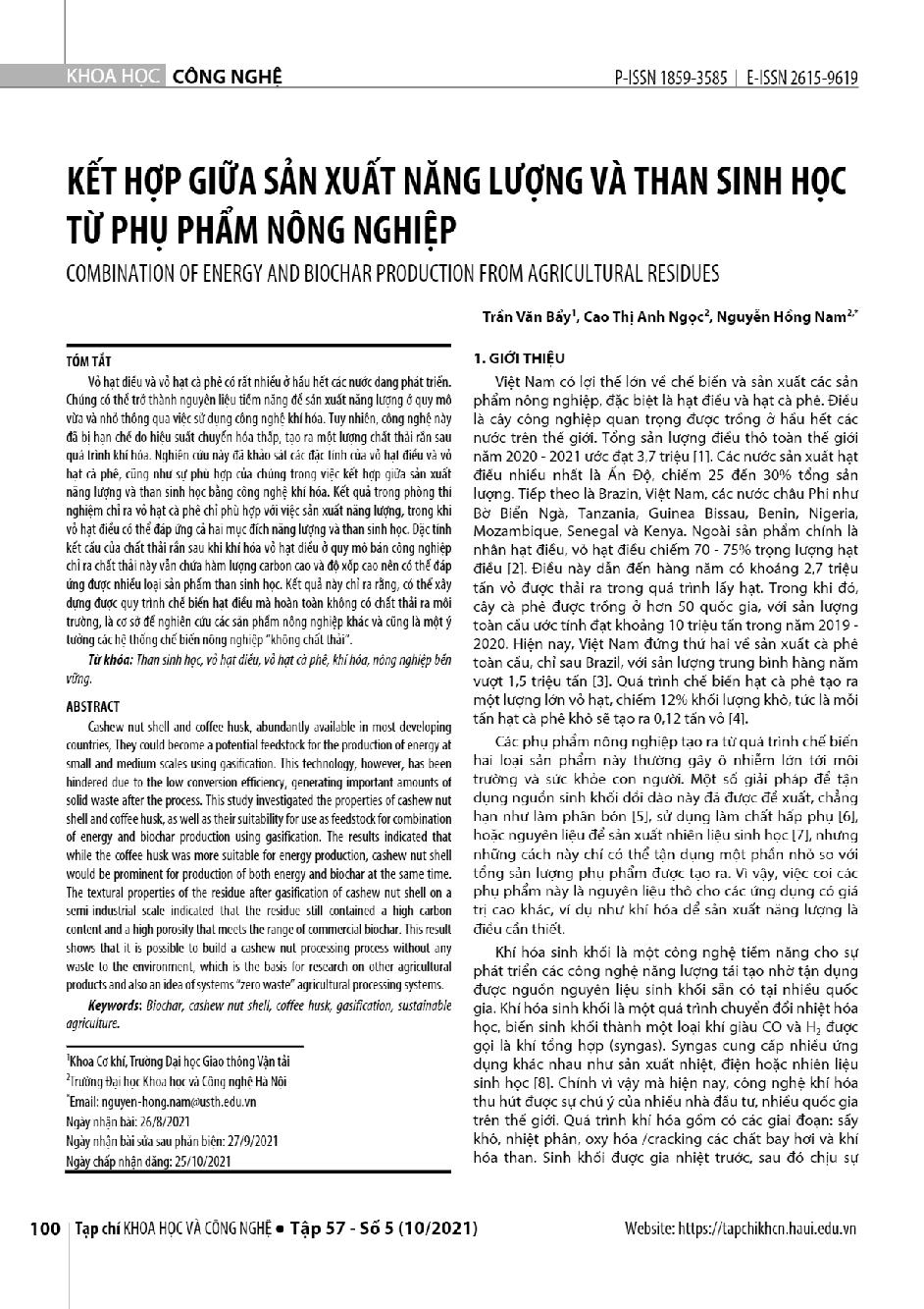 Kết hợp giữa sản xuất năng lượng và than sinh học từ phụ phẩm nông nghiệp = Combination of energy and biochar production from agricultural residues