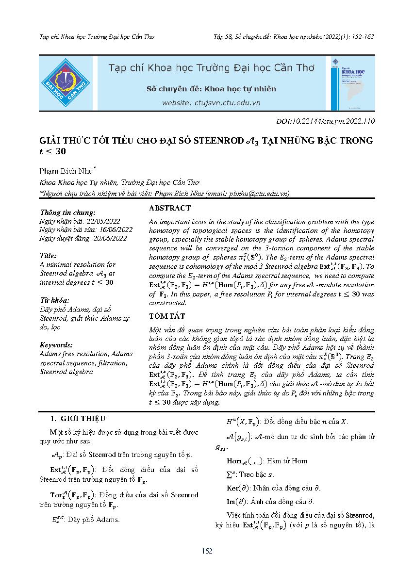 Giải thức tối tiểu cho đại số steenrod A_3 tại những bậc trong t≤30 = A minimal resolution for Steenrod algebra 3 at internal degrees ≤ 30