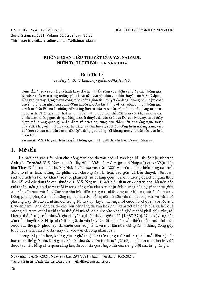 Không gian tiểu thuyết của V.S. Naipaul nhìn từ lí thuyết đa văn hoá = The space of V.S. Naipaul’s novels in the light of multicultural theory