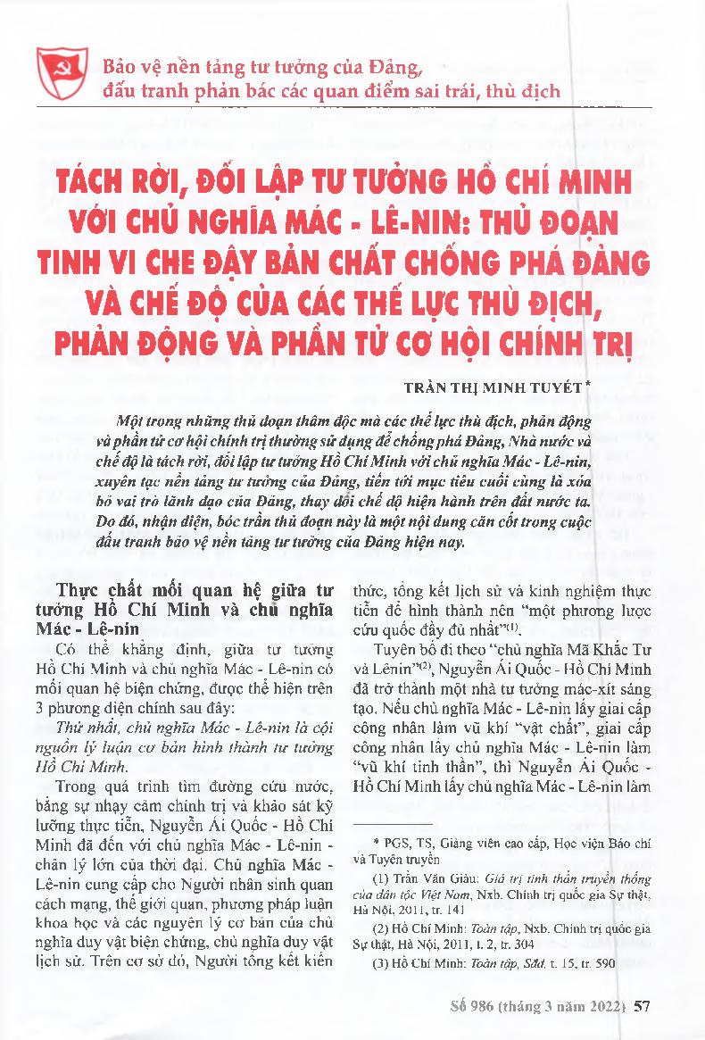 Tách rời, đối lập tư tưởng Hồ Chí Minh với chủ nghĩa Mác - Lê-nin: Thủ đoạn tinh vi che đậy bản chất chống phá Đảng và chế độ của các thế lực thù địch, phản động và phần tử cơ hội chính trị = Separating and opposing Ho Chi Minh&; 39;s thought with Marxism-