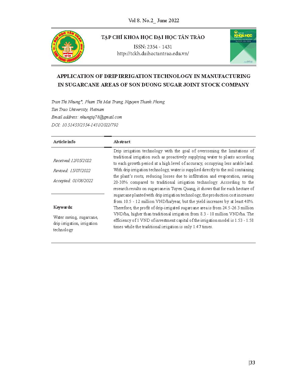 Ứng dụng công nghệ tưới nhỏ giọt trong sản xuất tại vùng nguyên liệu mía của công ty cổ phần mía đường = Application of drip irrigation technology in manufacturing in sugarcane areas of Son Duong sugar joint stock company