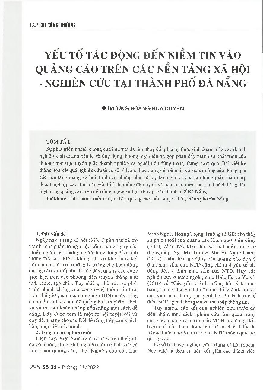 Yếu tố tác động đến niềm tin vào quảng cáo trên các nền tảng xã hội: Nghiên cứu tại thành phố Đà Nẵng = Factors affecting the trust of customers in advertisement on social media platforms: A case study of customers living in Da Nang city