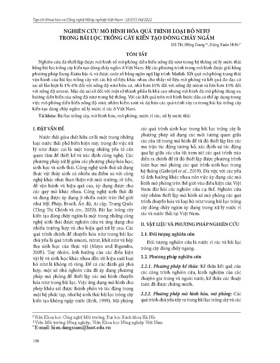 Nghiên cứu mô hình hóa quá trình loại bỏ nitơ trong bãi lọc trồng cây kiến tạo dòng chảy ngầm = Study on modeling of nitrogen removal process in subflow constructed wetland