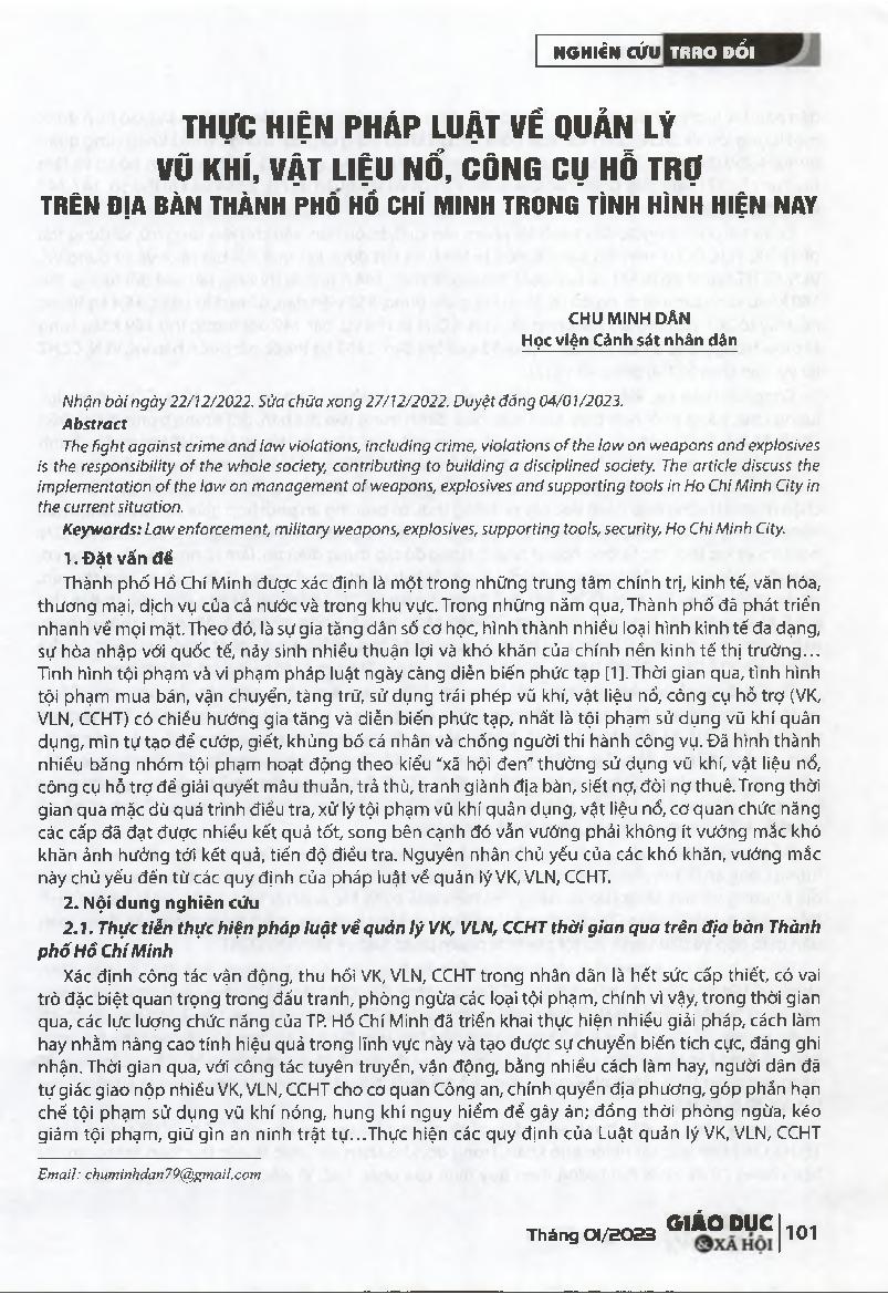 Thực hiện pháp luật về quản lý vũ khí, vật liệu nổ, công cụ hỗ trợ trên địa bàn Thành phố Hồ Chí Minh trong tình hình hiện nay = Implementation of the law on management of weapons, explosives and supporting tools in Ho Chi Minh City in the current situati