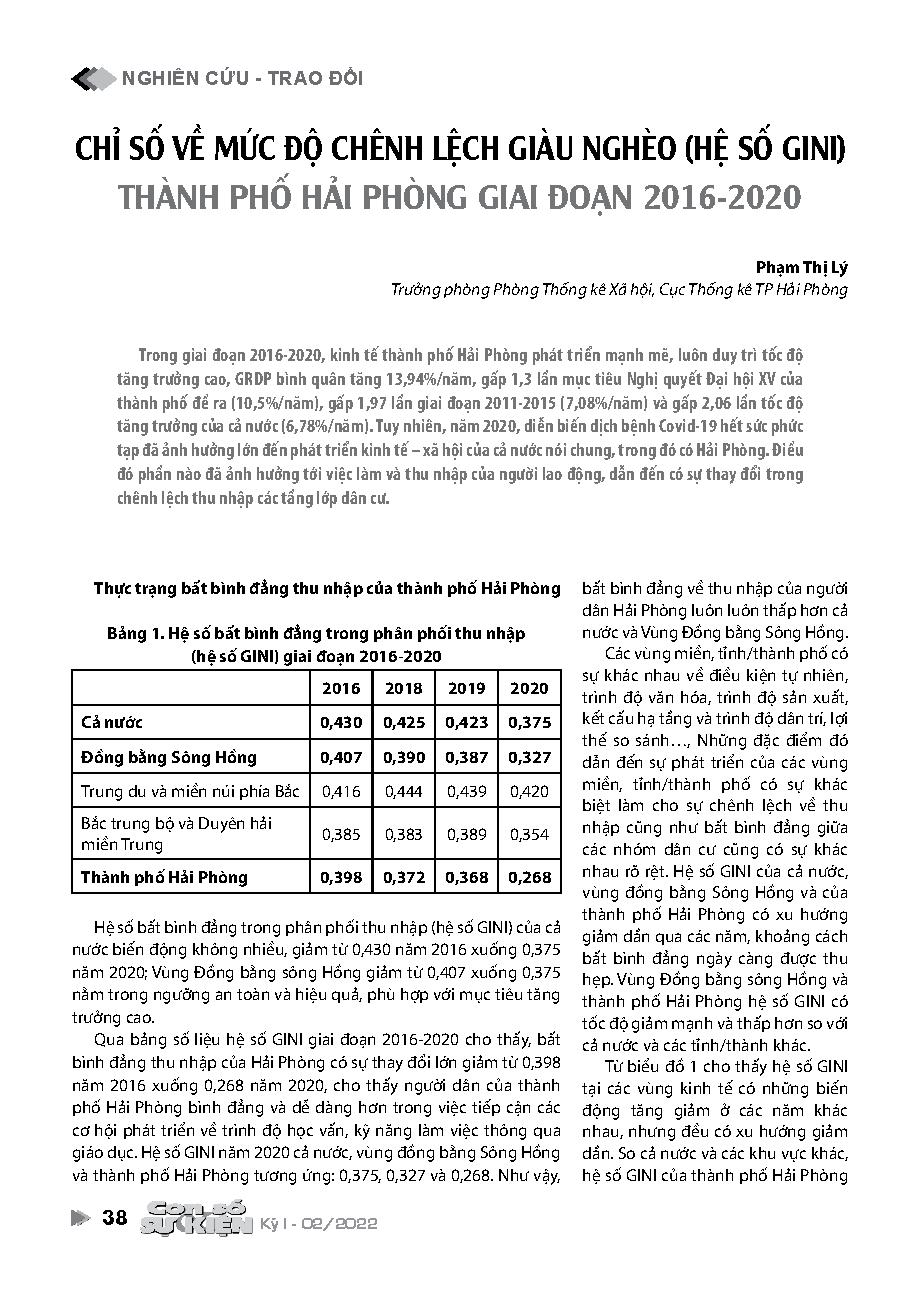 Chỉ số về mức độ chênh lệch giàu nghèo (hệ số gini): Thành phố Hải Phòng giai đoạn 2016-2020
