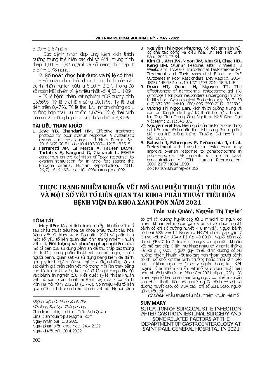 Thực trạng nhiễm khuẩn vết mổ sau phẫu thuật tiêu hóa và một số yếu tố liên quan tại Khoa Phẫu thuật tiêu hóa Bệnh viện Đa khoa Xanh Pôn năm 2021 = Situation of surgical site infection after gastrointestinal surgery and some related factors at the departm
