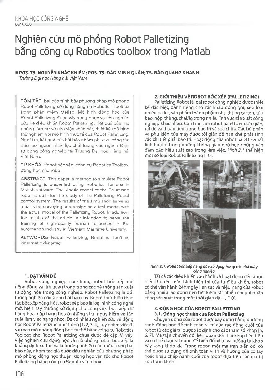 Nghiên cứu mô phỏng Robot Palletizing bằng công cụ Robotics toolbox trong Matlab = Research on simulation of Palletizing Robot with Robotics toolbox in Matlab
