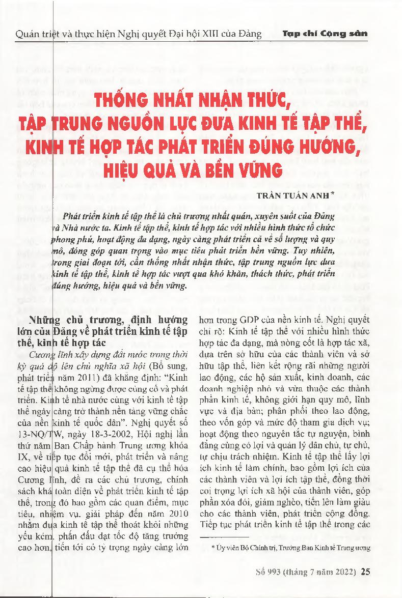 Thống nhất nhận thức, tập trung nguồn lực đưa kinh tế tập thể, kinh tế hợp tác phát triển đúng hướng, hiệu quả và bền vững = Unifying awareness and concentrating resources to bring the collective economy and the cooperative economy to the right direction,