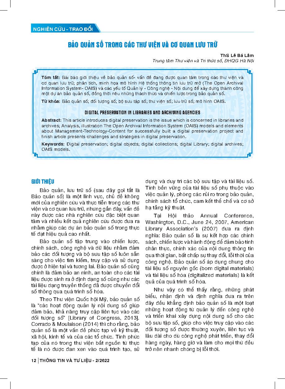 Bảo quản số trong các thư viện và cơ quan lưu trữ = Digital preservation in libraries and archiving agencies