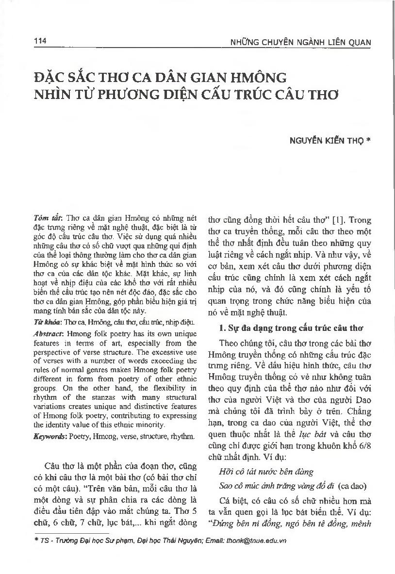 Đặc sắc thơ ca dân gian Hmông nhìn từ phương diện cấu trúc câu thơ = The distinctive features of the Hmong folk poetry from the perspective of verse structure