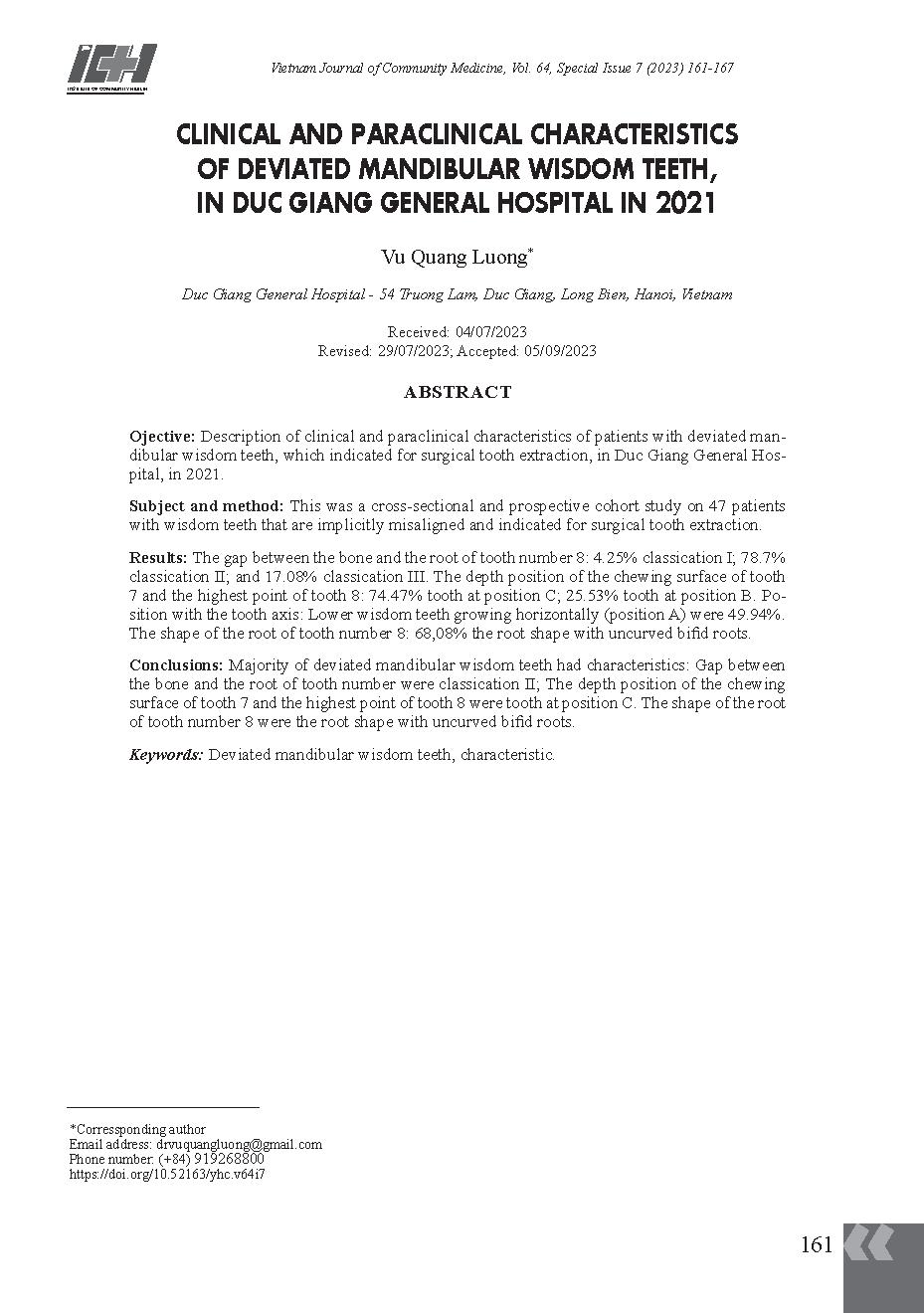 Đặc điểm lâm sàng, cận lâm sàng răng khôn hàm dưới mọc lệch, tại Bệnh viện Đa khoa Đức Giang năm 2021 = Clinical and paraclinical characteristics of deviated mandibular wisdom teeth, in Duc Giang General Hospital in 2021