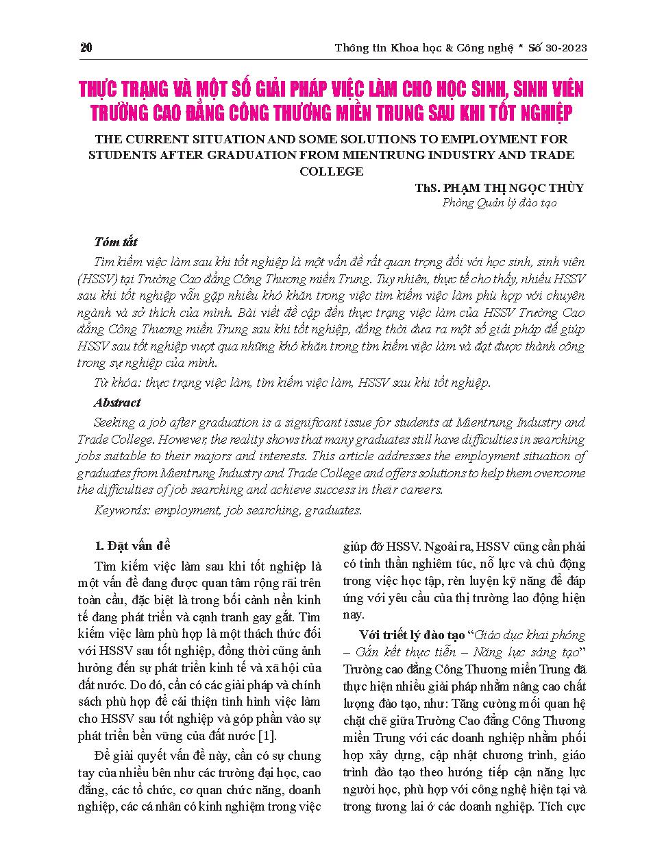 Thực trạng và một số giải pháp việc làm cho học sinh, sinh viên Trường cao đẳng Công Thương miền Trung sau khi tốt nghiệp = The current situation and some solutions to employment for students after graduation from Mien Trung Industry and Trade College