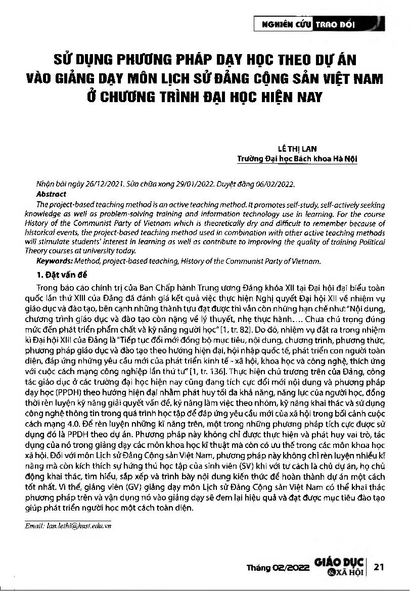 Sử dụng phương pháp dạy học theo dự án vào giảng dạy môn Lịch sử Đảng Cộng sản Việt Nam ở chương trình đại học hiện nay = Using the project-based teaching method in teaching the History of the Vietnamese Communist Party at university nowadays.