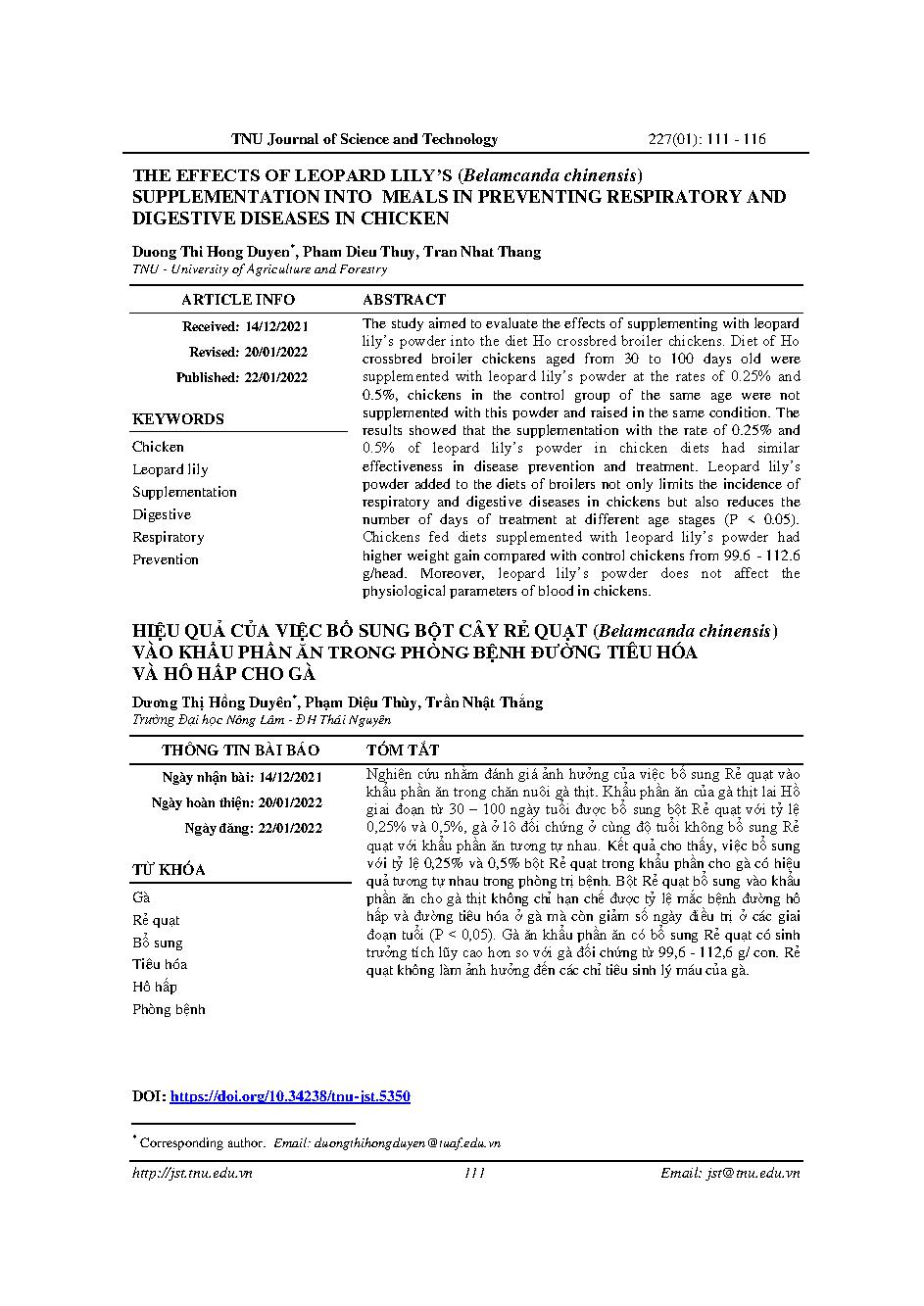 Hiệu quả của việc bổ sung bột cây rẻ quạt (Belamcanda chinensis) vào khẩu phần ăn trong phòng bệnh đường tiêu hóa và hô hấp cho gà = The effects of leopard lily’s (Belamcanda chinensis) supplementation into meals in preventing respiratory and digestive di
