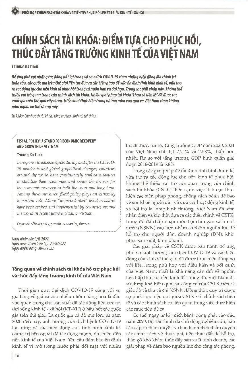 Chính sách tài khóa: Điểm tựa cho phục hồi, thúc đẩy tăng trưởng kinh tế của Việt Nam = Fiscal policy: A stand for economic recovery and growth of Vietnam