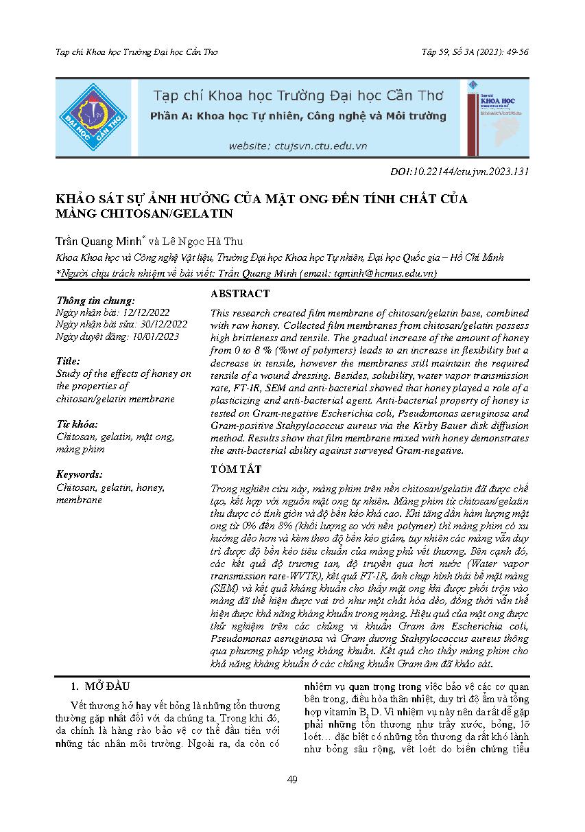 Khảo sát sự ảnh hưởng của mật ong đến tính chất của màng chitosan/gelatin = Study of the effects of honey on the properties of chitosan/gelatin membrane