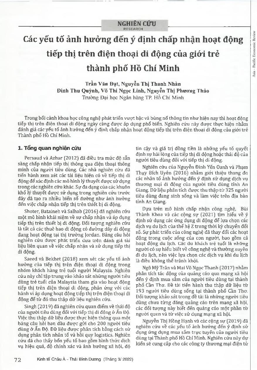 Các yếu tổ ảnh hưởng đến ý định chấp nhận hoạt động tiếp thị trên điện thoại di động của giới trẻ thành phố Hô Chí Minh