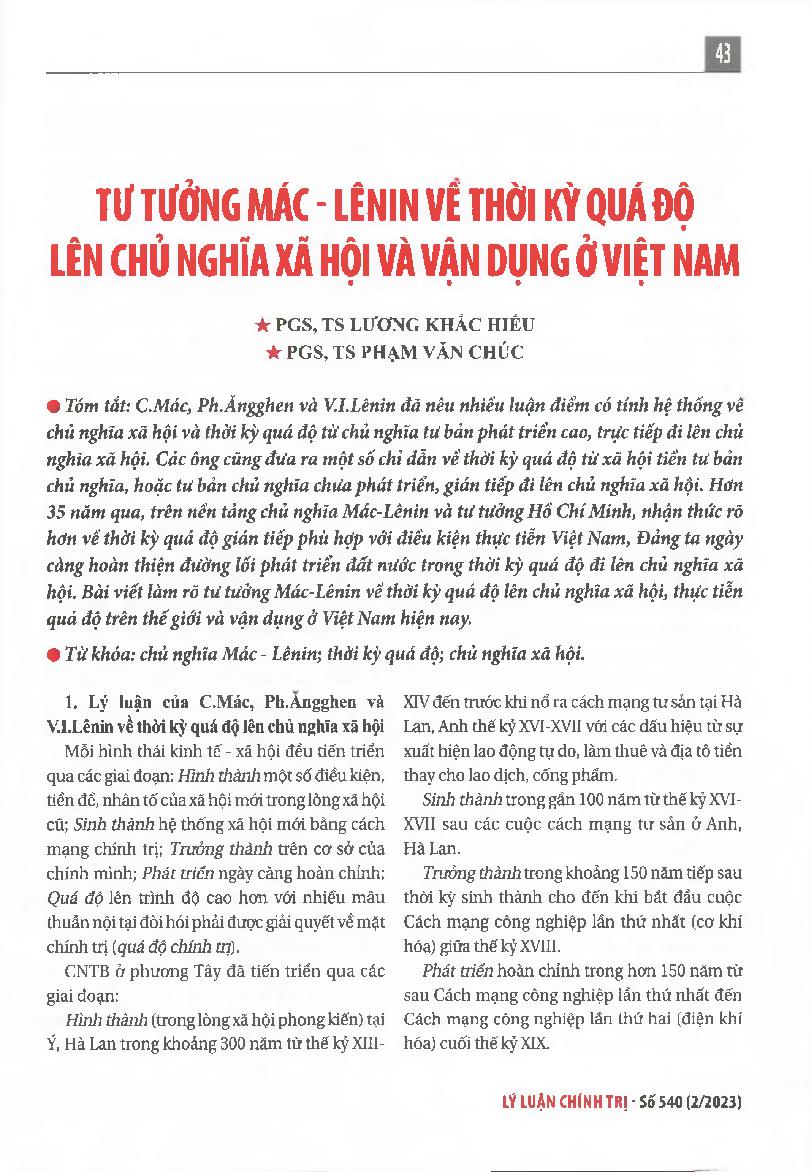 Tư tưởng Mác - Lênin về thời kỳ quá độ lên chủ nghĩa xã hội và vận dụng ở Việt Nam = Marxist-Leninist theory on the transitional period to socialism and its implementation in Vietnam