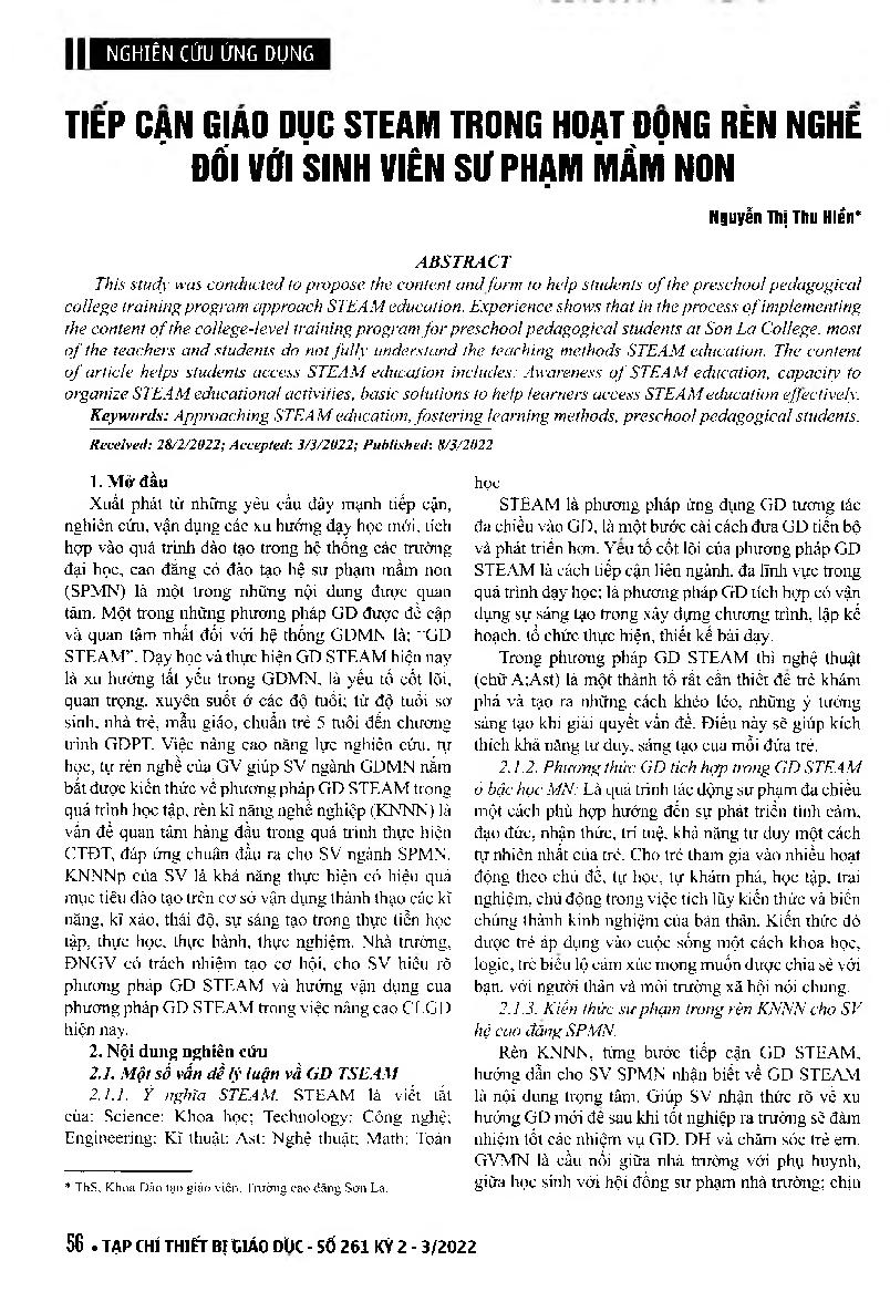 Tiếp cận giáo dục STEAM trong hoạt động rèn nghề đối với sinh viên sư phạm mầm non = Approaching STEAM education ỉn vocational training for Kindergarten pedagogical students