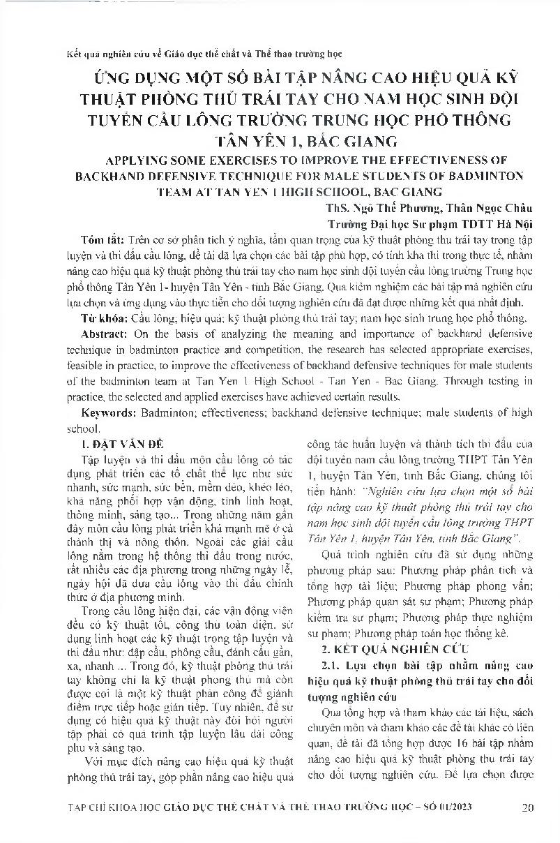 Ứng dụng một số bài tập nâng cao hiệu quả kỹ thuật phòng thủ trái tay cho nam học sinh đội tuyển Cầu lông Trường THPT Tân Yên 1, Bắc Giang = Applying some exercises to improve the effectiveness of backhand defensive technique for male students of badminto