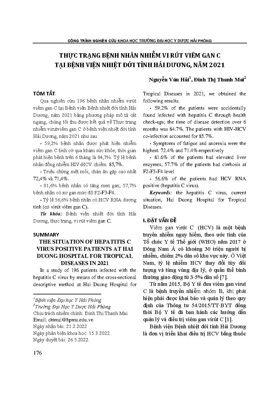 Thực trạng bệnh nhân nhiễm vi rút viêm gan C tại Bệnh viện Nhiệt đới tỉnh Hải Dương, năm 2021 = The situation of hepatitis C virus positive patients at Hai Duong hospital for tropical diseases in 2021