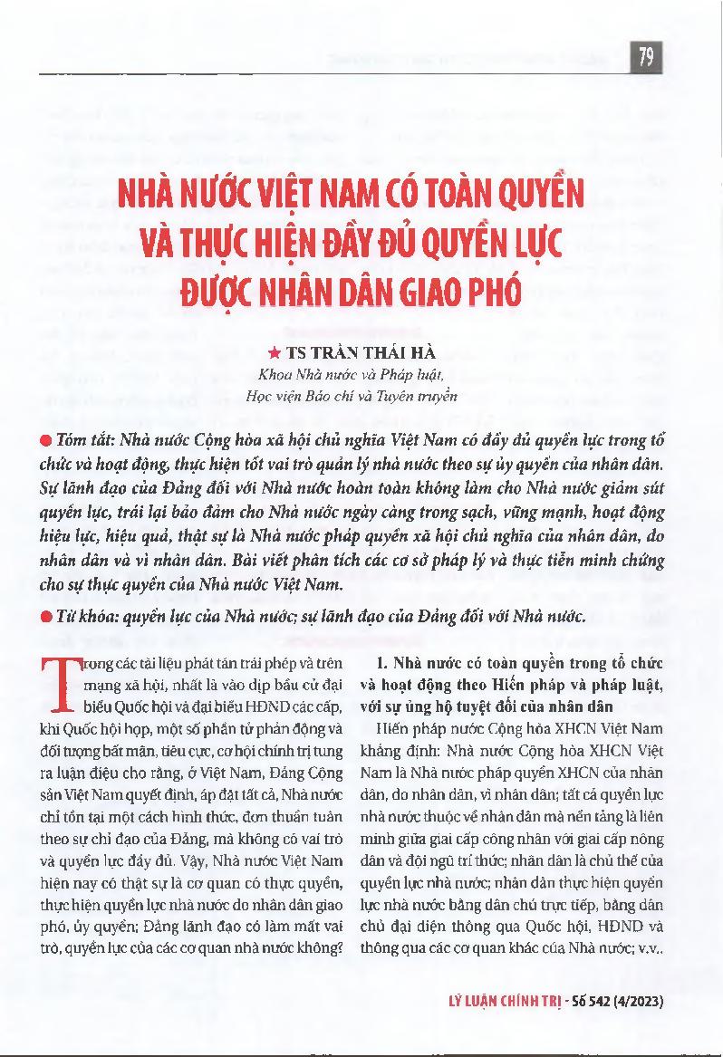 Nhà nước Việt Nam có toàn quyền và thực hiện đầy đủ quyền lực được nhân dân giao phó