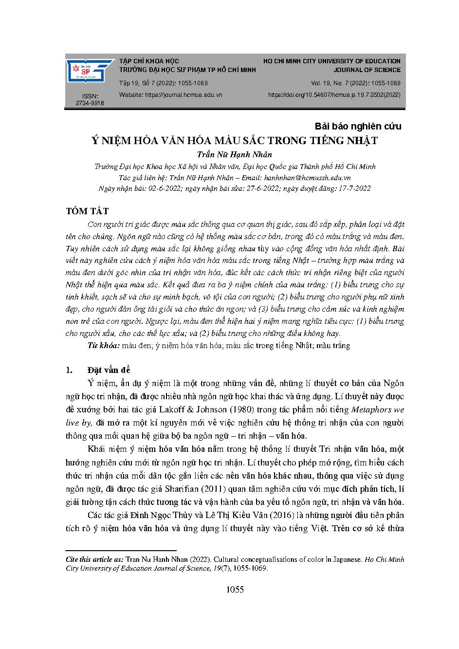 Ý niệm hóa văn hóa màu sắc trong tiếng Nhật = Cultural conceptualisations of color in japanese
