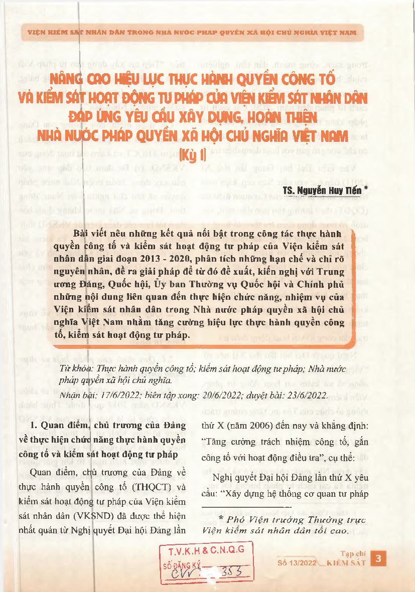 Nâng cao hiệu lực thực hành quyền công tố và kiểm sát hoạt động tư pháp của Viện kiểm sát nhân dân đáp ứng yêu cầu xây dựng, hoàn thiện Nhà nước pháp quyền xã hội chủ nghĩa Việt Nam (Kỳ 1) = Improve effectiveness of the People’s Procuracy to exercise the