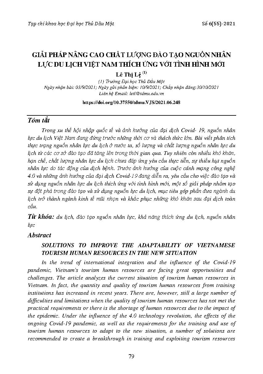Giải pháp nâng cao chất lượng đào tạo nguồn nhân lực du lịch việt nam thích ứng với tình hình mới = Solutions to improve the adaptability of vietnamese tourism human resources in the new situation