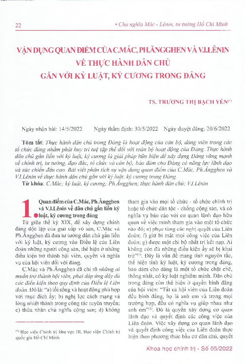 Vận dụng quan điểm của C.Mác, Ph.ăngghen và V.I.Lênin về thực hành dân chủ gắn với kỷ luật, kỷ cương trong Đảng = Applying the viewpoints of Marx, Fangen and V.I. Lenin on democratic practice associated with discipline and discipline in the Party